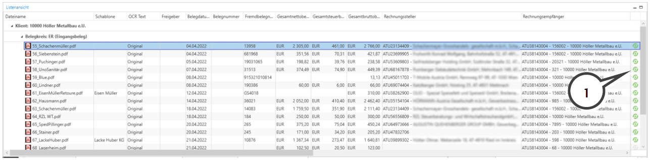 Durch einen Doppelklick auf die Zeile in der Listenansicht wird der Beleg aufgerufen und im rechten Bereich werden die Ergebnisse der Belegdatenerkennung angezeigt.