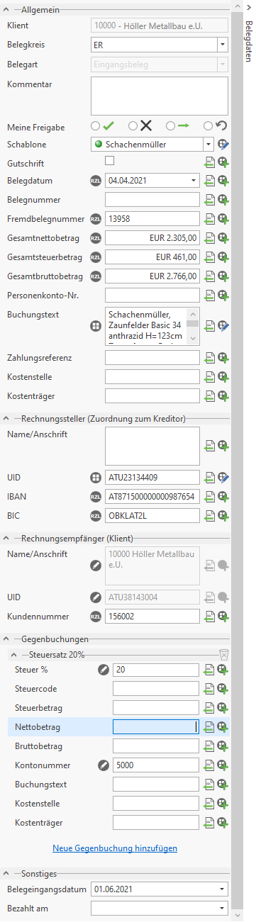 Die Felder im Bereich Allgemein werden bei der Verbuchung in das jeweilige Feld übernommen. Die Felder beim Rechnungsaussteller bzw. Rechnungsempfänger sind dafür da, um den richtigen Kreditor bei ER bzw. Debitor bei AR vorschlagen zu können.