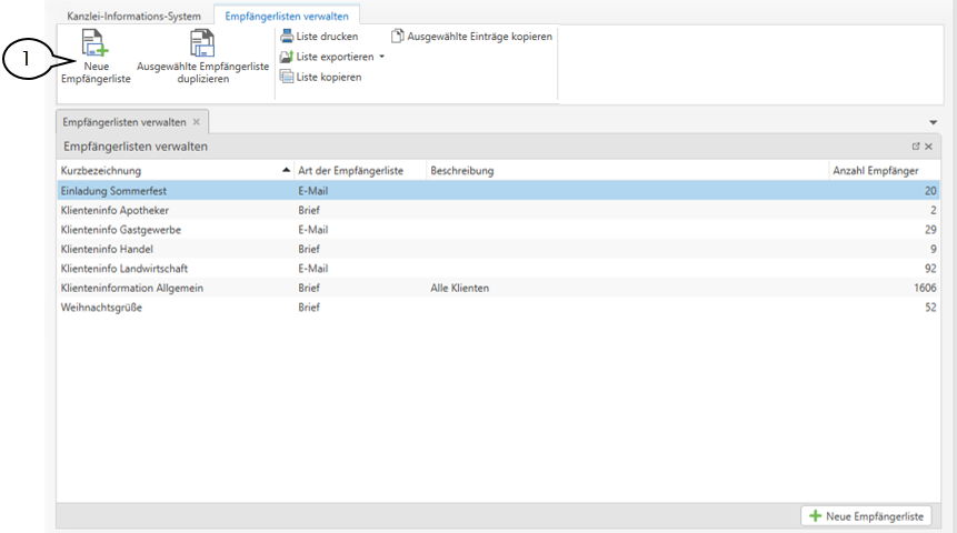 Mit einem Doppelklick auf eine Liste kann in die entsprechende Empfängerliste gewechselt werden. Über die Schaltfläche Neue Empfängerliste (1) gelangen Sie in die Neuanlage einer Empfängerliste.