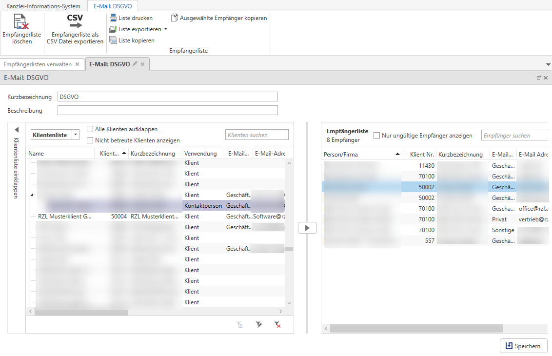 Markieren Sie eine Person/Firma in der Empfängerliste, springt das Board automatisch in der Klienten- bzw. Personenliste auf die markierte Person/Firma. Sind Sie mit der Bearbeitung der Empfängerliste zufrieden, schließen Sie diese durch die Schaltfläche Speichern ab.