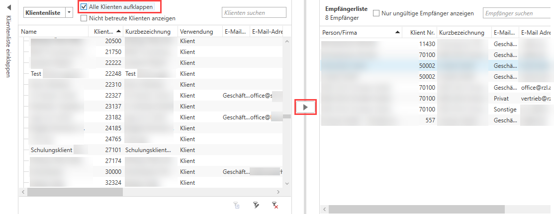 In dieser Liste sehen Sie nun sämtliche Adressen des Klienten, der Kontaktpersonen, der Gesellschafter und der gesetzlichen Vertreter. Aus dieser Liste können Sie nun Ihren gewünschten Empfänger für diesen Klienten wählen und anschließend mit dem großen Pfeil zur Empfängerliste hinzufügen. Dabei ist es möglich, gleich mehrere Klienten/Personen auf einmal zu markieren und gleichzeitig hinzuzufügen. So können Sie beispielsweise Ihre Klientenliste nach bestimmten Informationen wie Klient Auswahlkriterium „Metallgewerbe“ und Verwendung Auswahlkriterium „Allg. Ansprechpartner“ filtern. Haben Sie sämtliche Filter gesetzt, die zum gewünschten Ergebnis führen, können Sie alle Einträge mit STRG + A auswählen und mit dem Pfeil zur Empfängerliste hinzufügen. Eine genauere Beschreibung zu den Filtern finden Sie unter Listenfunktionen. Das Hinzufügen zur Empfängerliste ist auch über Drag & Drop möglich.