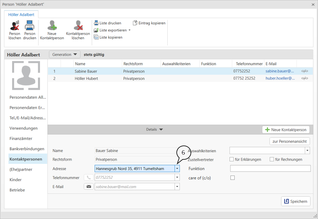 Die Adresse, die Ihnen in der Klientenliste bei den Kontaktpersonen, gesetzlichen Vertretern und Gesellschaftern angezeigt wird, ist jeweils die direkt hinterlegte Adresse in den Stammdaten des Klienten.