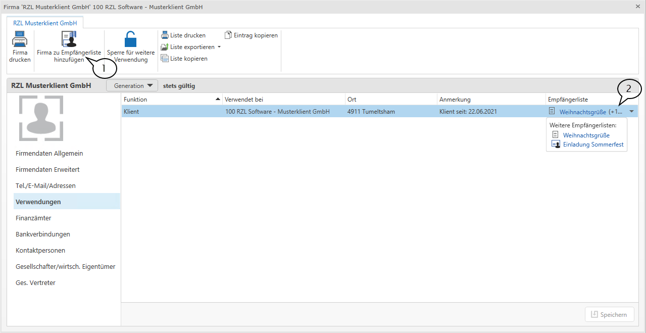 In den Klientenstammdaten wird weiters angezeigt, wer für diesen Klienten in welcher Empfängerliste vertreten ist (2).