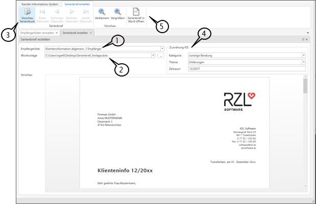 Durch die Schaltfläche Serienbrief in Word öffnen (5) kann der Brief in Word geöffnet werden, individuell adaptiert und anschließend gedruckt oder als PDF-Datei gespeichert werden.
