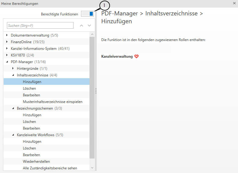 In diesem Fenster können Sie sich mithilfe des Reglers (1) alle Funktionen einblenden lassen. Die Funktionen für die Sie keine Berechtigung besitzen sind hier in der Liste grau hinterlegt.