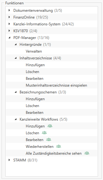 Für das Modul PDF-Manager wurden beispielsweise 13 von 16 möglichen Funktionen für diese Rolle aktiviert. Sie können hier also auf den ersten Blick sehen, ob für dieses Modul alle Berechtigungen vergeben wurden oder nicht.