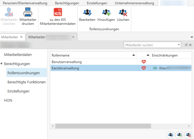 Öffnen Sie die Stammdaten eines Mitarbeiters finden Sie auch hier eine Liste mit den Rollenzuordnungen inkl. Einschränkungen. Sie können in diesem Reiter Rollen hinzufügen oder löschen und die Einschränkungen ändern.