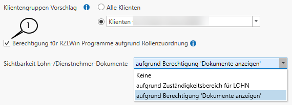 Diese Auswahlmöglichkeit (1) gab es bereits ähnlich im Kanzlei-Informations-System. Aktivieren Sie diese Option, können Klienten in den RZLWin Programmen nur in Abhängigkeit der zugeordneten Funktion und Klientengruppe(n) geöffnet werden.