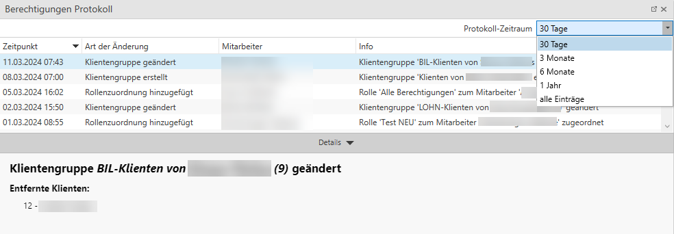 Im Berechtigungen Protokoll werden alle Änderungen im Zuge des Berechtigungssystems protokolliert. Es wird Datum und Uhrzeit der Änderung angezeigt, der Mitarbeiter, der die Änderung durchgeführt hat, die Art der Änderung sowie eine Informationsspalte, in welcher die durchgeführte Änderung genau beschrieben wird.