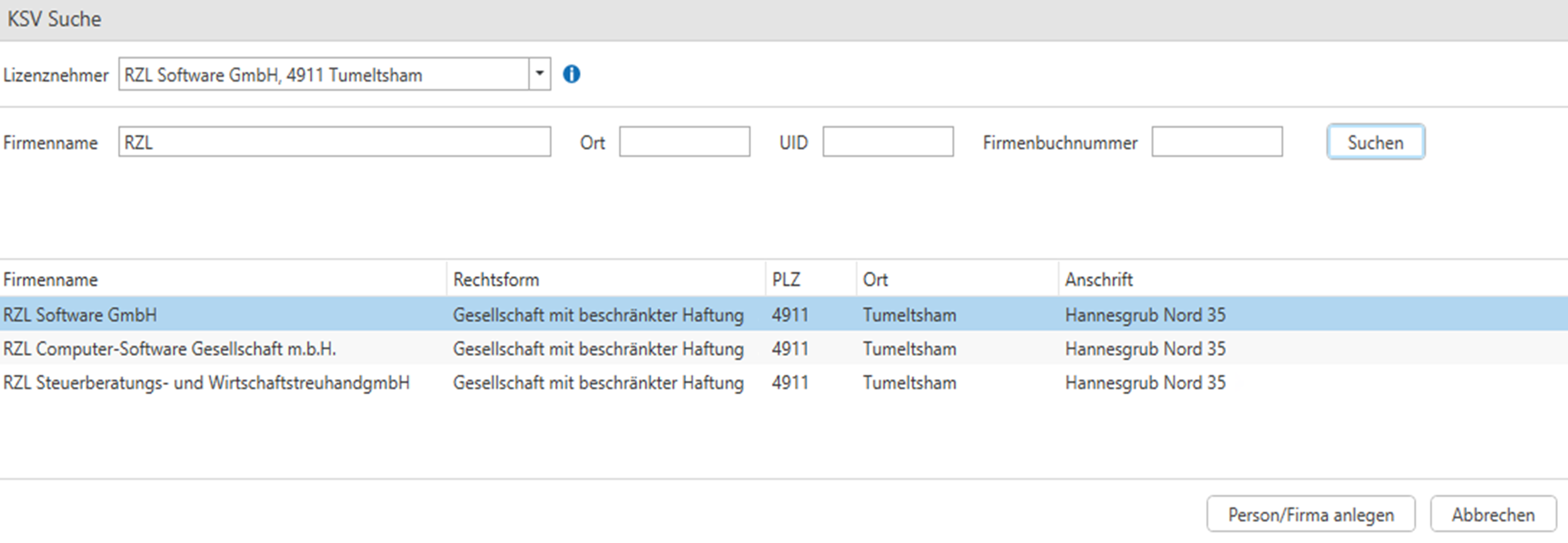 Neben der Möglichkeit die Stammdaten bei Neuanlage eines Firmen-Klienten zu übernehmen, besitzt die KSV1870 Suche eine weitere Funktion. Mithilfe der KSV1870 Suche können Sie eine Stammdatenabfrage für Firmen mit Sitz in Österreich durchführen.