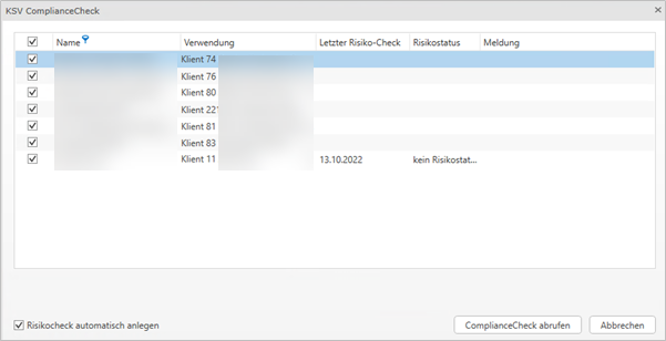Wählen Sie links in den Kästchen die Klienten an, für den Sie den ComplianceCheck abrufen wollen. Auch bei dieser Variante kann der ComplianceCheck automatisch als Risikocheck angelegt werden.
