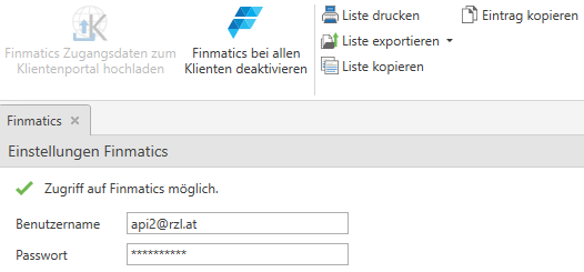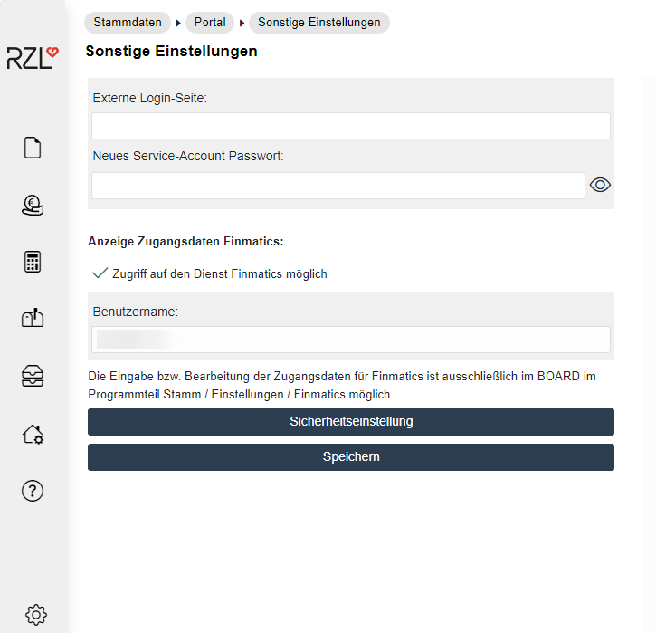Die Zugangsdaten, die Sie nach Bestellung des Moduls „Finmatics Connect für RZL“ von Finmatics erhalten haben, müssen im RZL Board eingetragen werden.