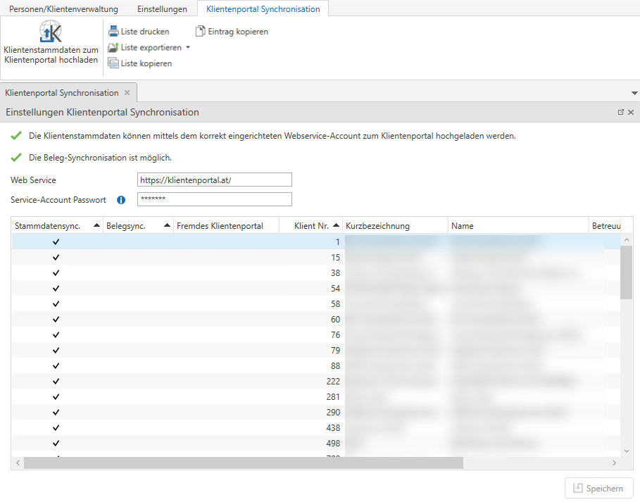 Im unteren Bereich dieser Ansicht ist eine Liste jener Klienten angeführt, die für das Klientenportal aktiviert sind und deren Stammdaten bzw. Belege nun synchronisiert werden.