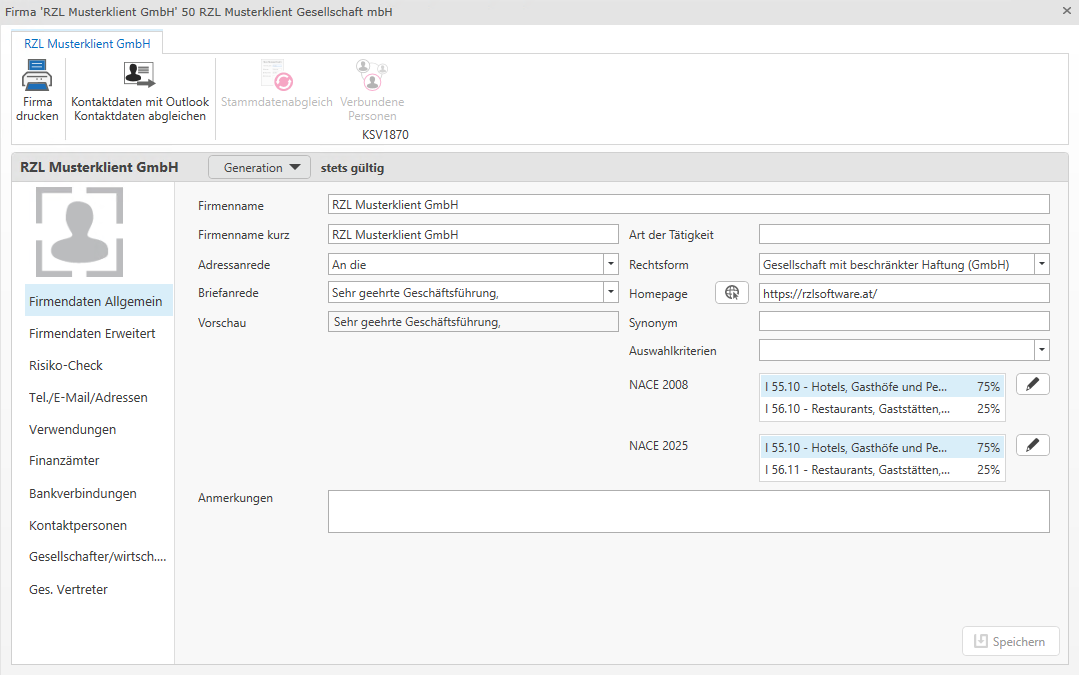 In der Startansicht werden die zentralen Firmendaten angezeigt. Die grundsätzliche Bedienung unterscheidet sich nicht von der Personenansicht. Die Firmendaten werden in Firmendaten Allgemein und Firmendaten Erweitert unterteilt.