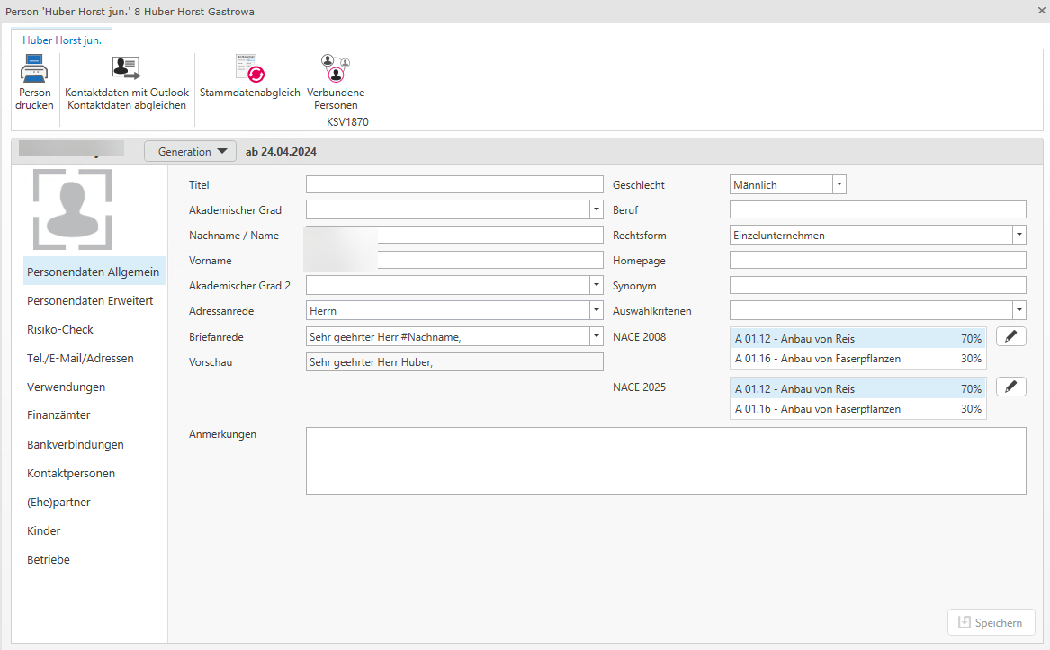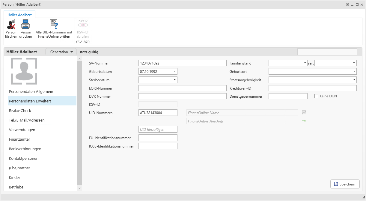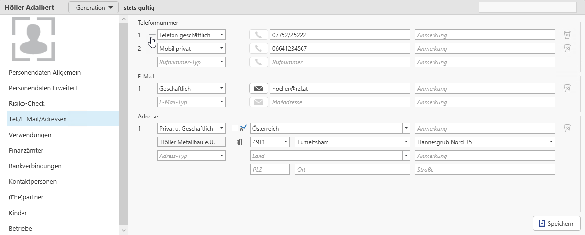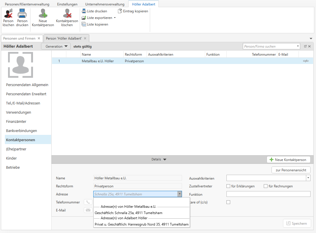 In der Startansicht werden die zentralen Personendaten angezeigt. Über die Leiste auf der linken Seite können die einzelnen Bereiche der Stammdaten der Person gewählt werden. Mittels Speichern werden die eingegebenen Daten übernommen. Die Übersicht (Liste) der Personen und Firmen bleibt in einem eigenen Tab offen. Durch Klick auf diesen Tab können weitere Personen/Firmen geöffnet werden.