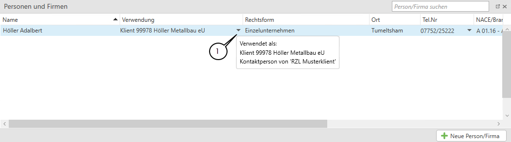 Die jeweiligen Verwendungen einer Person werden in einer eigenen Spalte dargestellt. Liegen bei einer Person mehrere Verwendungen vor (z.B. als Kontaktperson eines Klienten und als Gesellschafter eines anderen Klienten) kann über das Dreiecksymbol (1) die Liste aller Verwendungen aufgeklappt werden.