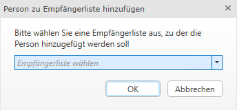 Sie haben weiters die Möglichkeit, die Person in diesem Dialog einer bereits bestehenden Empfängerliste hinzuzufügen. Wählen Sie dazu die Schaltfläche Person zu Empfängerliste hinzufügen (2).