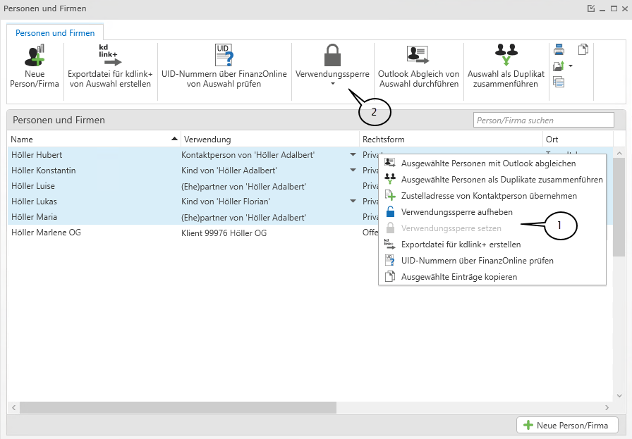 Über die Personenübersicht können Sie diese Änderung in den Stammdaten auch über mehrere Personen hinweg treffen. Dazu markieren Sie die betreffenden Personen (alle markieren STRG+A, mehrere markieren mithilfe der STRG-Taste) und wählen über das Kontextmenü (1) oder das obere Menüband (2) Verwendungssperre aufheben/setzen. Je nach Status der Verwendungssperre wird diese dann bei den ausgewählten Personen geändert.