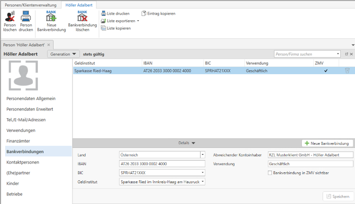 Hier können Sie die Bankverbindungen der Person eintragen. Das mit der Option Bankverbindung in ZMV sichtbar gekennzeichnetes Bankinstitut wird für den Zahlscheindruck innerhalb der RZL Honorarverrechnung (Klassik) verwendet. Über das Papierkorbsymbol bzw. über Bankverbindung löschen können Sie ein Geldinstitut löschen.