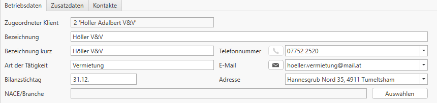 Im Bereich Betriebe können Sie die Betriebe bei einem Einzelunternehmer anlegen. Bei einem Einzelunternehmer können beliebig viele Betriebe angelegt werden. Jeder Betrieb kann in der Folge in den Stammdaten eines Klienten hinterlegt werden.