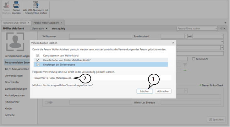 Im Löschdialog haben Sie die Möglichkeit, bestehende Verwendungen gleich direkt zu löschen (1). Einige Verwendungen sind hiervon ausgenommen und müssen direkt bei der Verwendung gelöscht werden (2). Ausgenommene Verwendungen sind z.B. Klient, Mitarbeiter oder Zustellvertreter für Erklärungen und/oder Rechnungen.