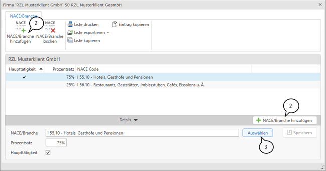 Im folgenden Dialogfeld können Sie die NACE/Branche hinzufügen und mit Klick auf Auswählen die Liste der zur Verfügung stehenden NACE-Codes aufrufen. Es ist möglich mehrere NACE-Codes auszuwählen und eine prozentuelle Verteilung vorzunehmen bzw. eine der eingetragenen NACE-Codes als Haupttätigkeit zu kennzeichnen.