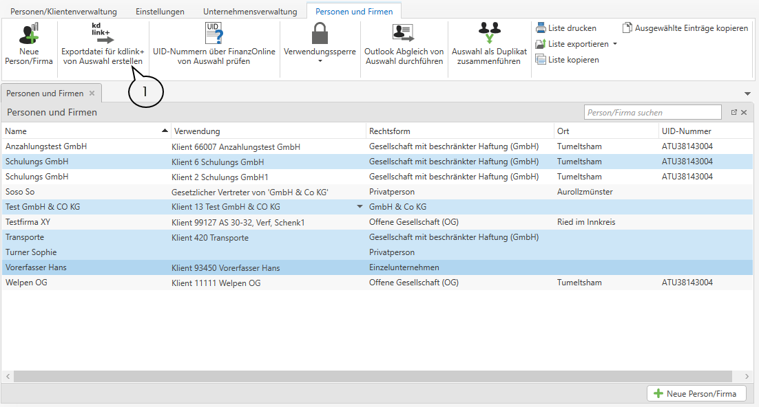 Sie finden den Export für diese Datei in der Stammdatenverwaltung des RZL Boards. In der Übersicht der Personen/Firmen bzw. in der Übersicht der Klienten können Sie sich über die Schaltfläche Exportdatei für kdlink+ von Auswahl (1) eine Exportdatei der ausgewählten Einträge erstellen.