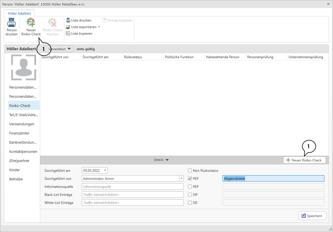 In den Stammdaten einer Person bzw. Firma haben Sie nun im Register Risiko-Check die Möglichkeit, die Informationen aus dem Risiko-Check zu hinterlegen. Über die Schaltfläche Neuer Risiko-Check (1) können Sie einen neuen Risiko-Check anlegen. Automatisch werden das aktuelle Datum und der Mitarbeiter, der den Risiko-Check durchführt übernommen. Die restlichen Felder müssen manuell befüllt werden.