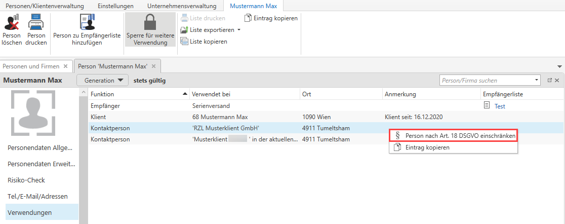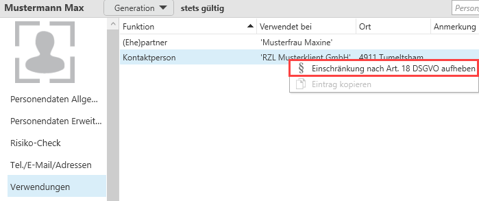 Sofern Sie über die Funktion Einschränkungen DSGVO verfügen, können Sie in den Stammdaten eine Person für eine bestimmte Verwendung einschränken. Dazu muss die Person aus der Personen-/Firmenübersicht geöffnet werden. Diese Funktion ist in den Stammdaten der Person im Register Verwendung zu finden. Über das Kontextmenü einer bestimmten Verwendung, können Sie die Person für diese eine Verwendung einschränken.