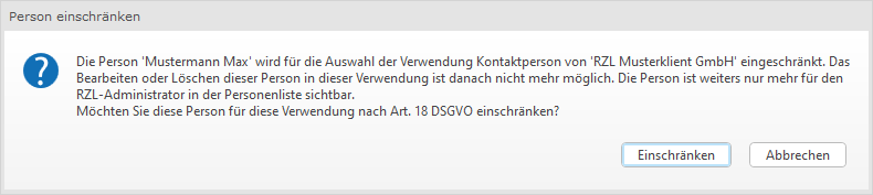 Nach Bestätigung dieser Abfrage wird die ausgewählte Person für diese Verwendung gesperrt. Nach der Einschränkung kann diese Person in dieser Verwendung nicht mehr gelöscht oder bearbeitet werden und kann auch nicht mehr weiterverwendet werden. Diese eingeschränkte Person (eingeschränkte Hauptperson) ist dann nur mehr für Mitarbeiter mit entsprechender Rolle in der Übersicht Personen/Firmen grau dargestellt sichtbar. Wird eine eingeschränkte Person aus dieser Ansicht geöffnet, können die Daten dieser Person nicht bearbeitet werden.