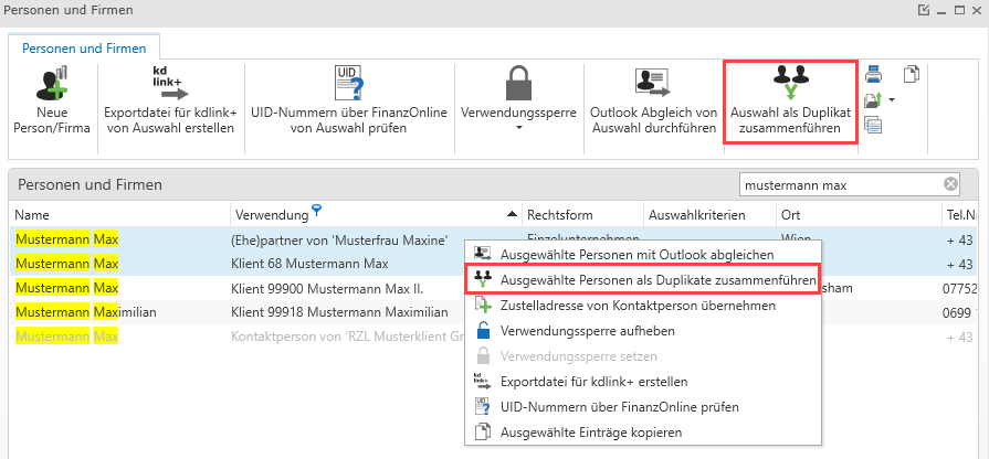 Nach dem Zusammenführen der Duplikate haben Sie den Ausgangszustand bei Personen mit mehreren Verwendungen wiederhergestellt.