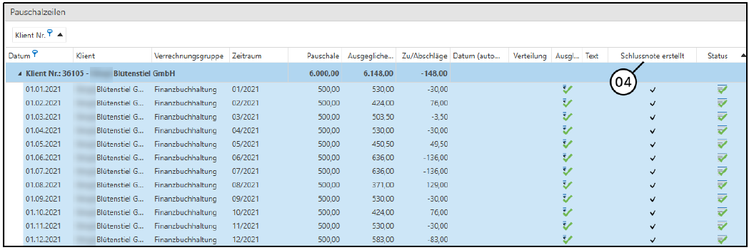 Pauschalzeilen, über die eine Schlussnote erstellt wurde, sind in der Ansicht der Pauschalzeilen in der Spalte Schlussnote erstellt (4) ersichtlich.
