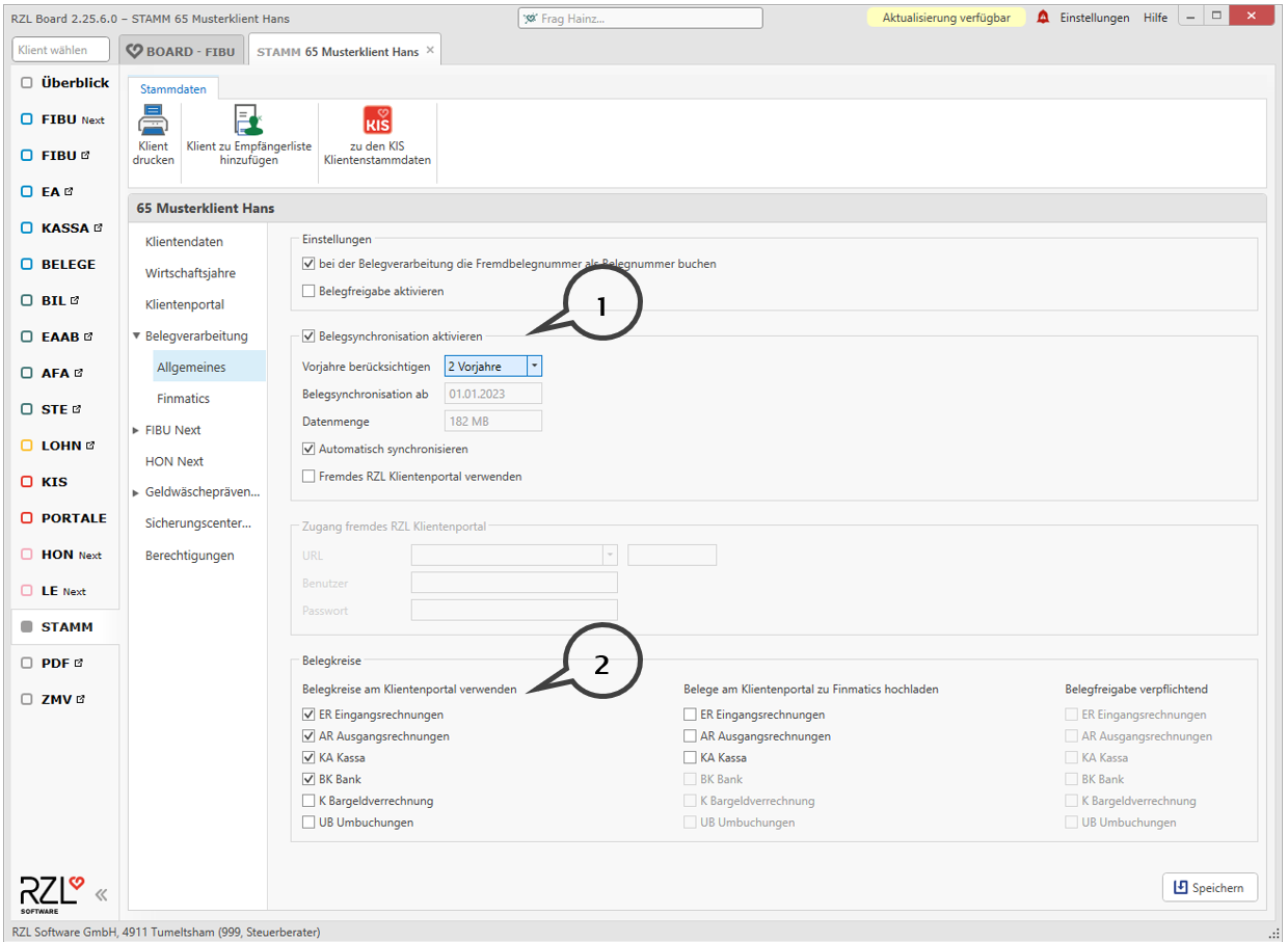 In den Stammdaten des Klienten im Board können Sie festlegen, welche Belegkreise ihrem Klienten beim Hochladen der Belege zur Verfügung stehen.