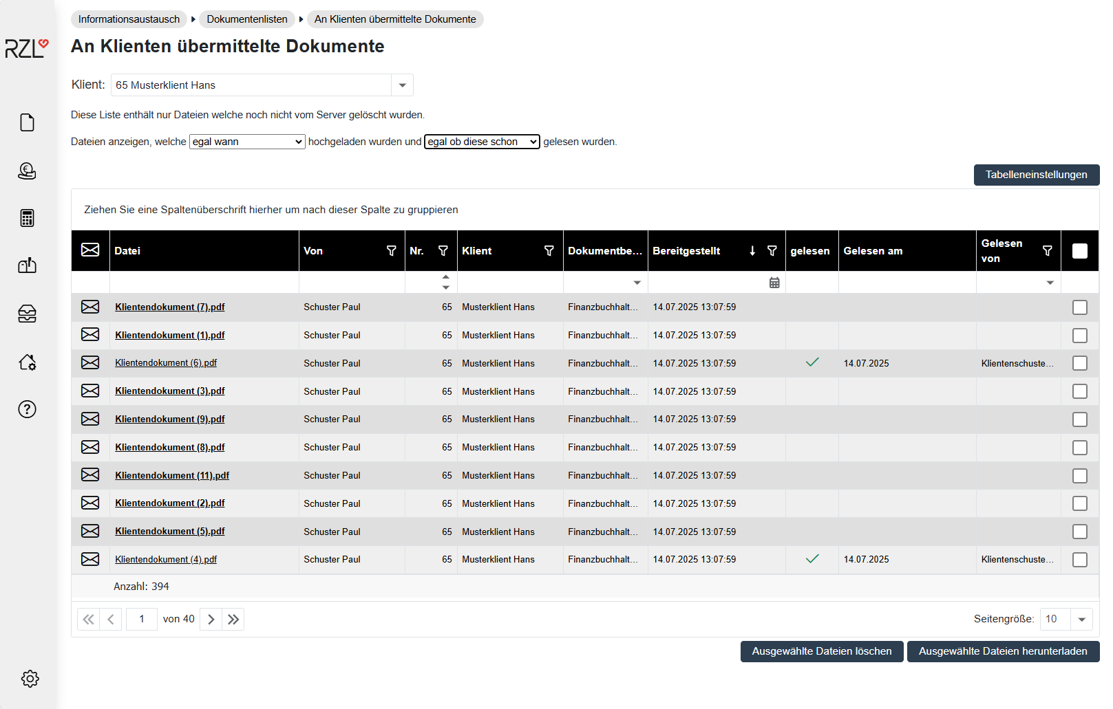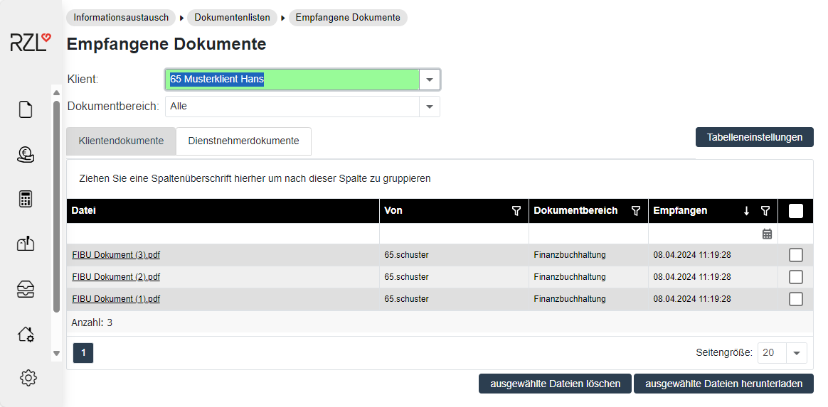 Sie können die Ansicht auf einzelne Klienten einschränken oder die Dokumente aller Klienten auflisten.