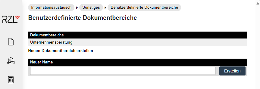 Im Programmpunkt Informationsaustausch / Sonstiges können unter dem gleichnamigen Menüpunkt benutzerdefinierte Dokumentbereiche angelegt werden. Diese stehen dann ebenfalls im Auswahldialog neben den Standard-Dokumentbereichen (entspricht den lizensierten Programmen) zur Verfügung.