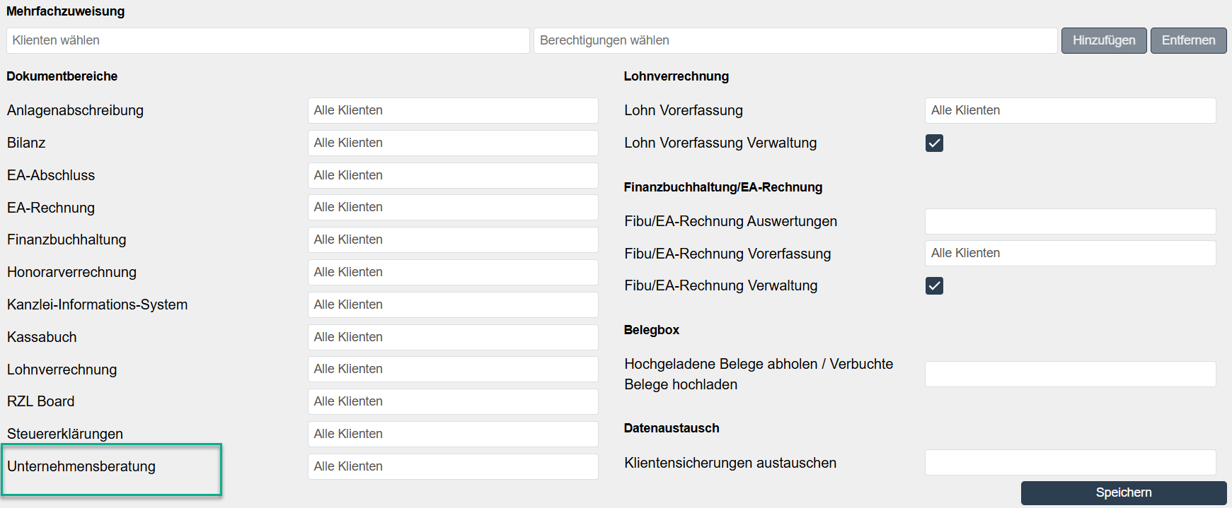Damit Ihr Klient auch diesen neuen Dokumentbereich verwenden kann, ist dieser in den Benutzerstammdaten des Klienten zu aktivieren. Gehen Sie hierfür unter Stammdaten / Klienten / Klientenstammdaten und wählen Sie die betreffenden Klienten aus. Anschließend sind bei den Berechtigungen die Dokumentbereiche beim gewünschten Benutzer anzuwählen und mit Speichern zu bestätigen.