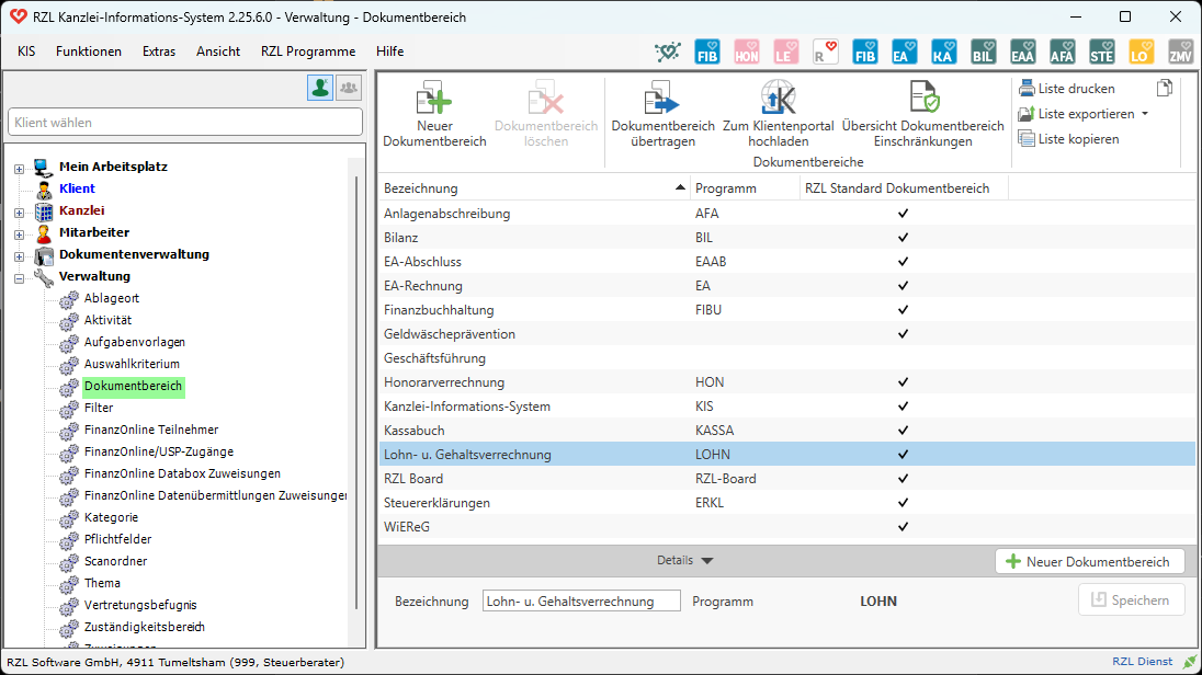 In der Übersicht werden alle vom Anwender lizensierten Programme als RZL Standard Dokumentbereich mit einem Hackerl versehen angeführt. Diese Dokumentbereiche können vom Anwender nicht verändert oder gelöscht werden.
