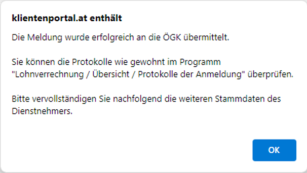 - Wählen Sie die Schaltfläche Daten an die ÖGK übermitteln an, um die Daten an die Österreichische Gesundheitskasse zu übermitteln. Sollten die erfassten Daten fehlerhaft oder unvollständig sein, erhalten Sie eine Fehlermeldung und die Daten werden nicht übermittelt. Nachfolgende Meldung wird nach Anwahl der Schaltfläche Daten an die ÖGK übermitteln angezeigt. Der zuständige Mitarbeiter in der WT-Kanzlei erhält eine E-Mail-Benachrichtigung, dass eine Meldung an die ÖGK erfolgt ist. Im Kanzleibereich des Portals steht ein Protokolleintrag für die durchgeführte Meldung zur Verfügung.