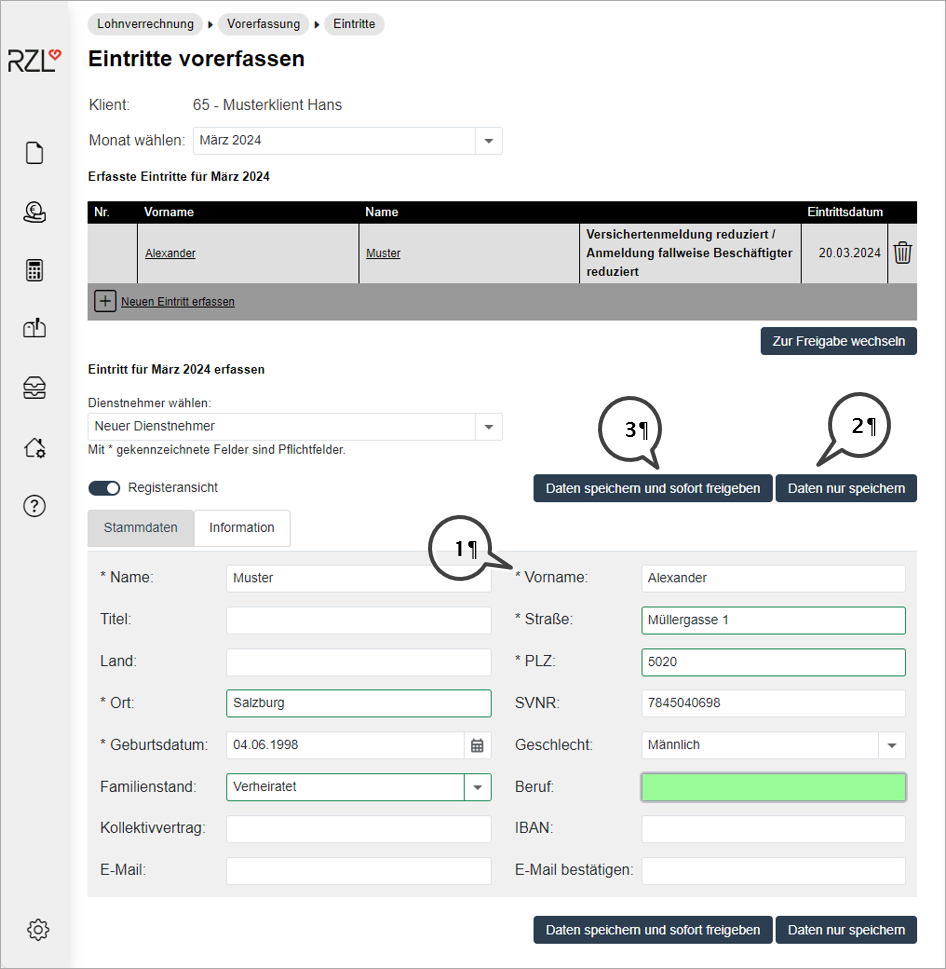 - Stehen Ihnen noch nicht alle notwendigen Daten zur Verfügung, können Sie die erfassten Daten zunächst nur speichern und später im Programmteil Lohnvorerfassung / Eintritte ergänzen und freigeben.