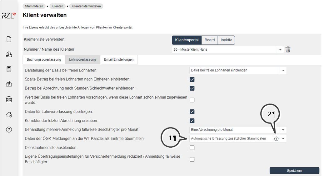 - Wählen Sie die Option Automatische Erfassung zusätzlicher Stammdaten an. Diese Option wird bei der Neuanlage eines Klienten im Portal automatisch vorgeschlagen.
