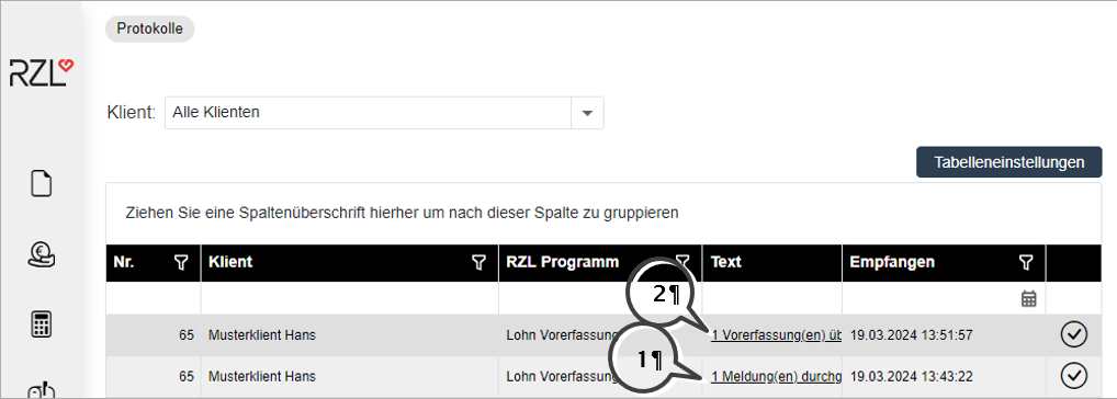 Im Kanzleibereich des Portals werden für die Meldung an die ÖGK (1) und die Freigabe der Vorerfassung (2) zwei Protokolleinträge für die jeweils berechtigten Mitarbeiter angezeigt.