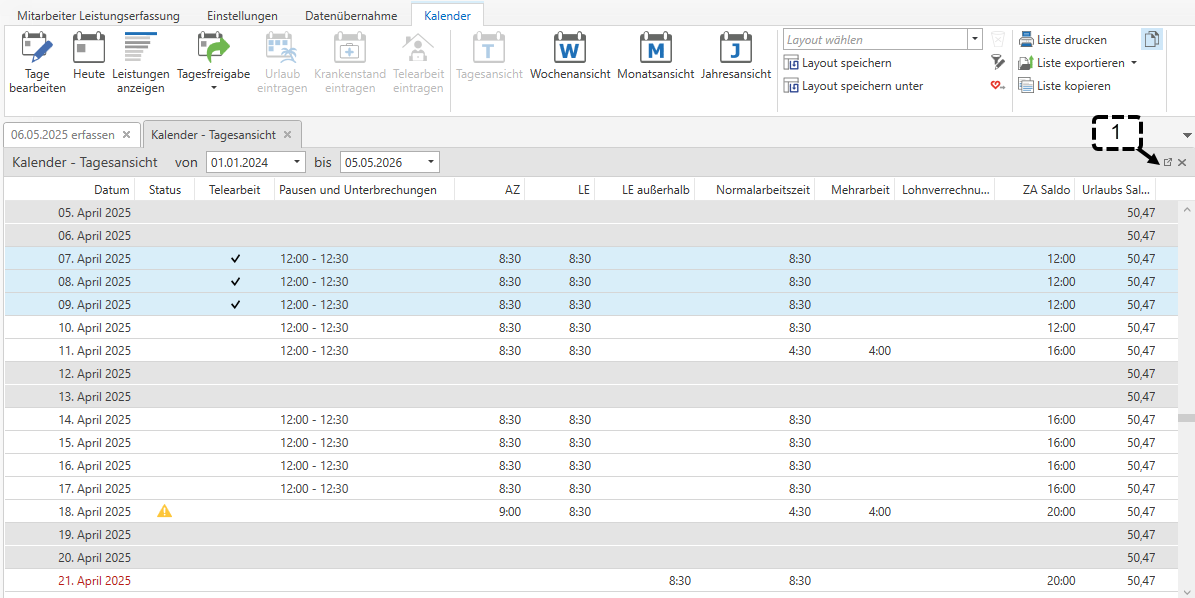 In der Leistungserfassung ist es möglich, mehrere Ansichten gleichzeitig geöffnet zu haben. Die einzelnen Ansichten sind über Tab-Reiter erreichbar. So können z. B. die Kalenderansicht und der erfasste Tag gleichzeitig geöffnet sein.