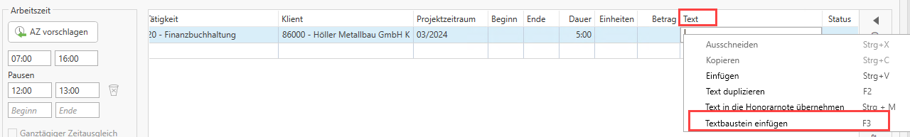 Die angelegten Platzhalter können mit der rechten Maustaste aufgerufen werden oder man gibt direkt die Nummer des Textbausteins ein und wählt die F3-Taste – es wird gleich der jeweilige Textbaustein eingefügt.