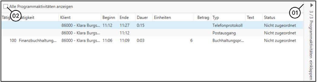 Die Programmaktivitäten können mittels Pfeil (1) eingeklappt oder ausgeklappt werden. Es gibt 3 mögliche Stadien, die Programmaktivitäten aufweisen können, und zwar: