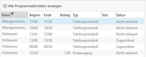 Ist in den Einstellungen die Zeiterfassung aktiv, so erscheinen die Aktivitäten in der Leistungserfassung unter dem Punkt Programmaktivitäten.