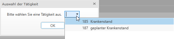 Gibt es in der Honorarverrechnung mehr als eine Krankenstandstätigkeit, dann müssen Sie bei der Eingabe des Krankenstandes die betroffene Tätigkeit auswählen.
