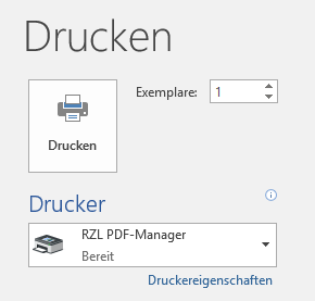 Klicken Sie dazu im betreffenden Programm (zum Beispiel MS Word) auf Drucken und wählen Sie bei Drucker „RZL PDF-Manager“ aus. Anschließend werden beim Drucken die Dokumente an den RZL PDF-Manager gesendet und automatisch als PDF-Dokument geöffnet.