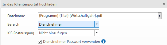 Mit der Schaltfläche Klientenportal (STRG + K) können Sie markierte Dokumente in das Klientenportal hochladen. Im Fenster In das Klientenportal hochladen vergeben Sie einen Dateinamen und den Bereich, in den das Dokument hochgeladen werden soll.