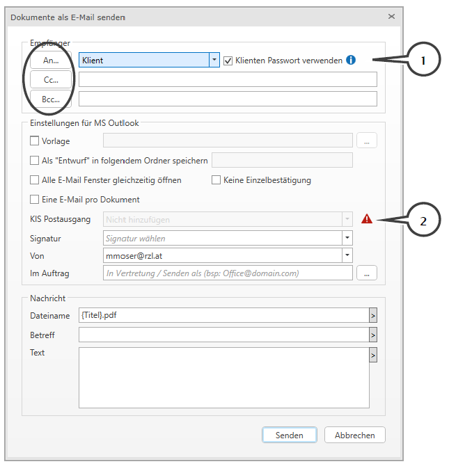Mit der Schaltfläche Versenden (STRG + M) können Sie ausgewählte Dokumente per E-Mail an Klienten, Dienstnehmer oder Kunden senden.