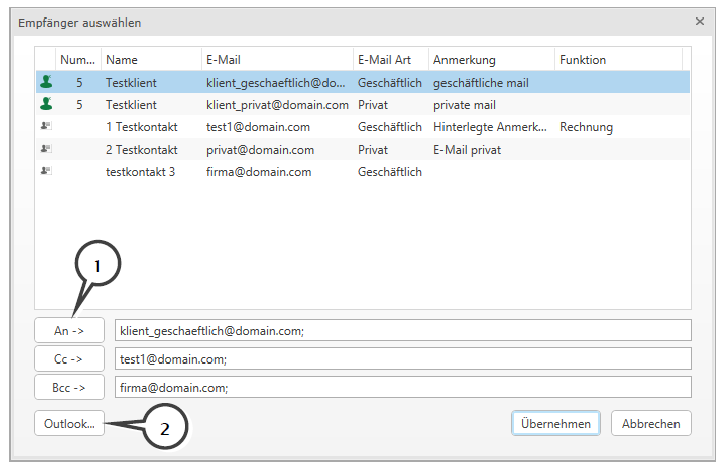 Die Schaltfläche (2) öffnet das MS Outlook Adressbuch. Falls auf Ihrem Rechner kein Microsoft Outlook installiert ist, ist diese Schaltfläche nicht verfügbar.